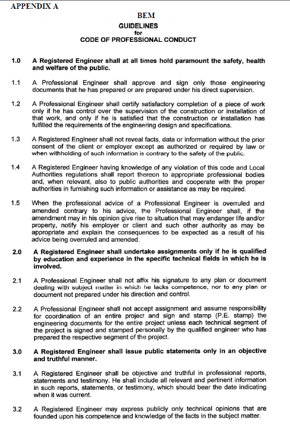 Registration New Registration. What is a Code of Professional Conduct. In this paper the author gives solution to one such problem presented by examining analyzing and applying the ethical theories and BEM Board of Engineers Malaysia code of professional.